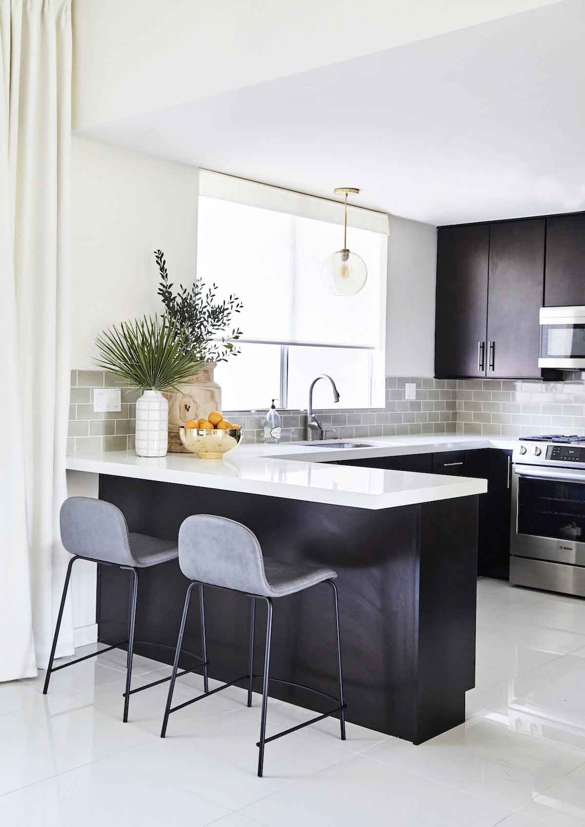 سفید رنگ ایده آل و متضادی است که آن را در کنار کابینت مشکی به عنوان یک رنگ کابینت دیگر، کاشی بین کابینتی، صفحه روی کابینت و کفپوش می توانید استفاده کنید.