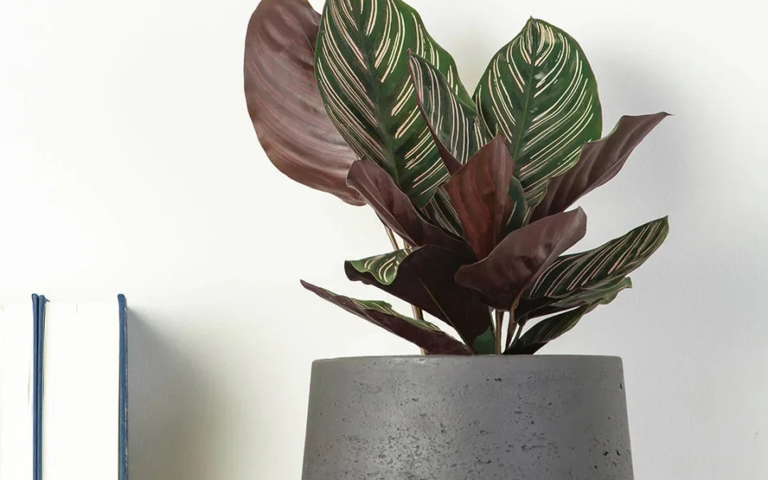 ترکیب رنگ سفید شیری یا عاجی با پایه چوبی، برای گلدان کالاتیا اورانتا مثل بوم خالیه که زیبایی برگهای خط دارش رو برجسته میکنه.