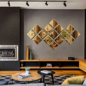 2. استفاده از پنلهای آینهای مربعی روی دیوار پشت مبل