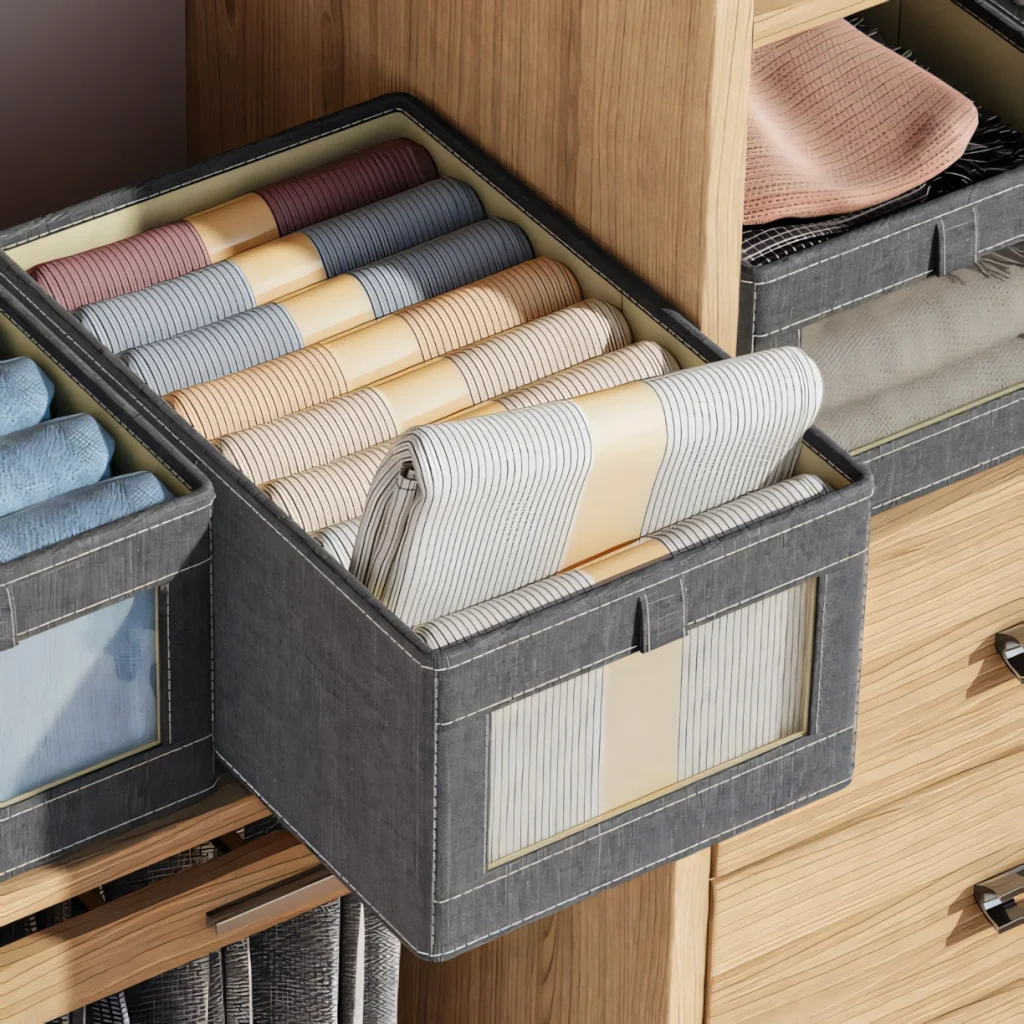 اگر کشوهای شما پر از لباسهای مختلف است، استفاده از باکسهای پارچهای چندخانه بهترین راه برای مرتب کردن آنهاست. این باکسها میتوانند لباسهای تاشو مانند تیشرتها، شلوارها و حتی لباسهای راحتی را به شکلی مرتب و قابل دسترس در داخل کشو نگه دارند. با انتخاب ارگانایزرهای با تقسیمبندی دقیق، لباسها همیشه بهراحتی در دسترس خواهند بود و بهراحتی میتوانید هر روز بدون نیاز به جستجو لباس دلخواه خود را پیدا کنید.