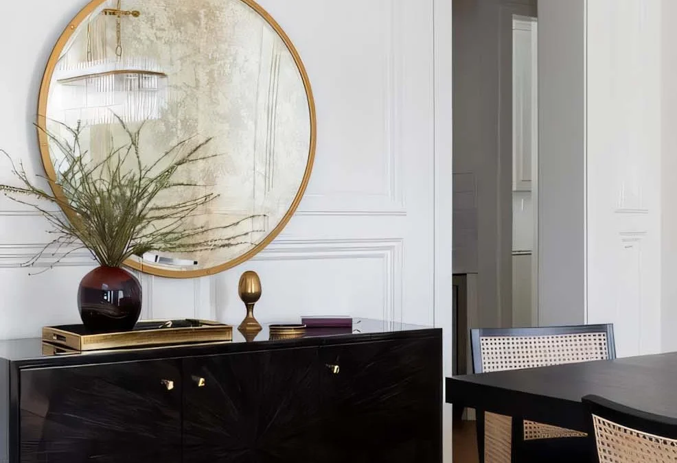 در فضای ناهارخوری، نصب یک آینه گرد طلایی باعث تقویت نور و حس توازن می‌شه. این آینه هم برای خانه‌های مدرن و هم نئوکلاسیک مناسبه و به خصوص در کنار لوسترهای شیشه‌ای جلوه‌ای چشمگیر پیدا می‌کنه.
