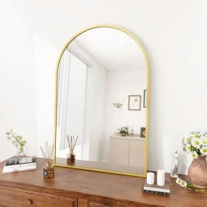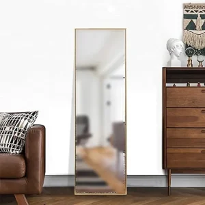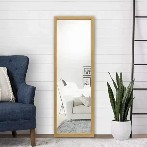 ۲. آینه ایستاده طلایی با قاب ساده برای اتاق خواب مینیمال