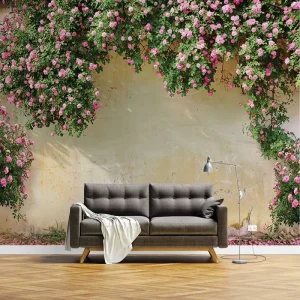 پوستر دیواری مدل منظره دیوار و گل های صورتی کد mt-83913