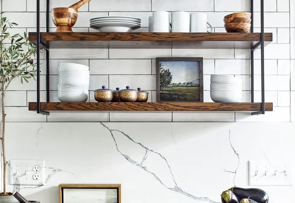 بهتره کجا نصبش کنی؟ بالای جزیره یا کنار یخچال برای نمایش وسایل تزئینی، ظروف خاص یا کتاب‌های آشپزی.