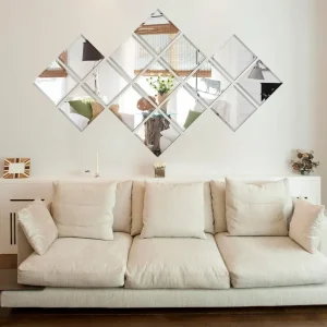 برای ایجاد حس وسعت و نور در فضا، میتونی کل دیوار رو با پنلهای آینهای مربعی بپوشونی. این ایده توی نشیمنهای کوچک یا فضاهای کمنور معجزه میکنه و حس هتلهای پنجستاره رو به خونهات میده.