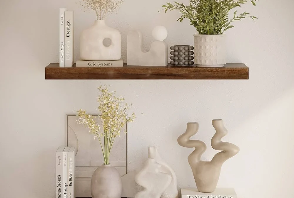 اگر دنبال حس طبیعی، گرم و بیتکلف هستی، شلفهای چوبی با لبههای منحنی یا بافت گرهدار انتخاب مناسبی هستن. مدلهای شناور، یعنی اون مدل هایی که پایه شان قابل دیدن نیست، باعث میشن فضای دیوار خلوت و مینیمال به نظر برسه. یادتون باشه که رنگهایی مثل گردویی، بلوطی یا چوب خام، گزینه های خوبی برای این نوع شلف ها هستند.