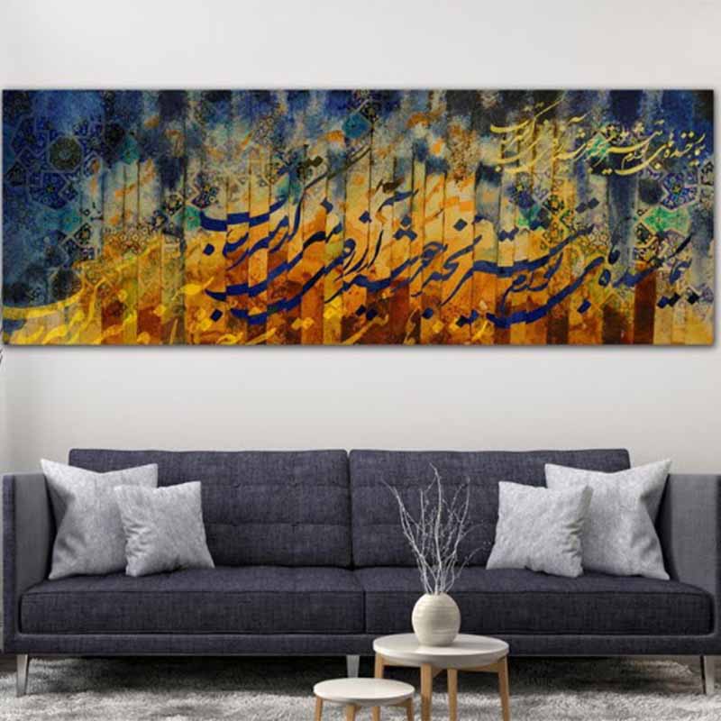 قیمت و خرید تابلو پذیرایی نقاشی خط خوشنویسی یک تکه، رنگ سرمه ای طلایی، از جنس بوم و دارای قاب، مخصوص نصب روی دیوار