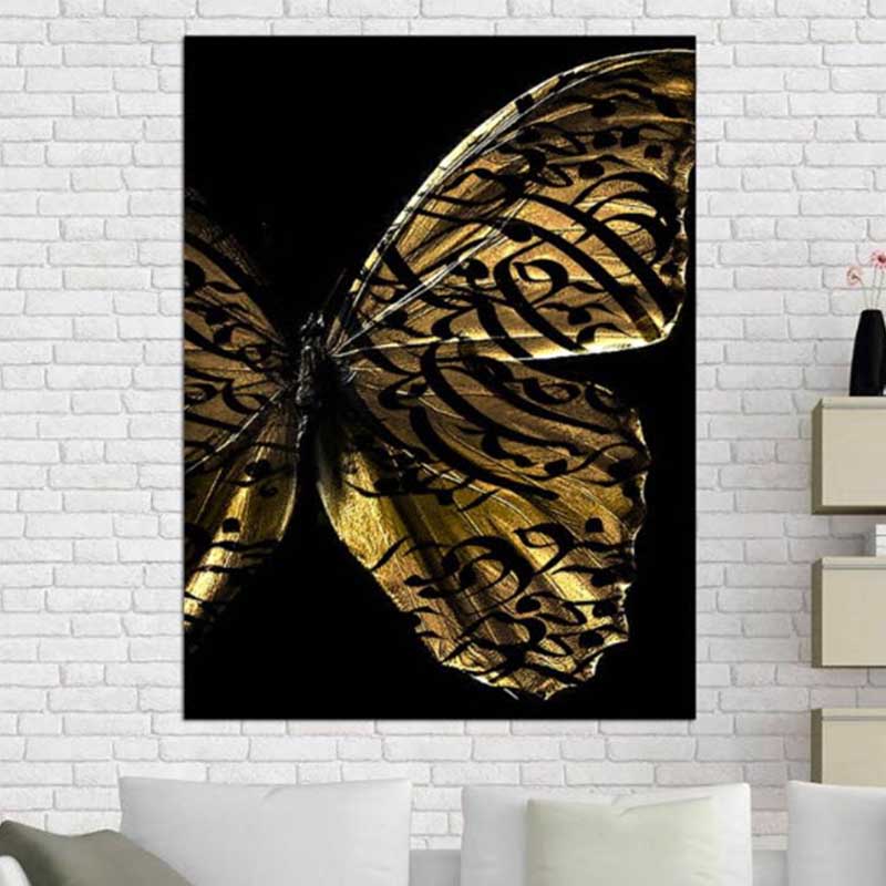 قیمت و خرید تابلو اتاق خواب نقاشی خط یک تکه، طرح پروانه مشکی طلایی، از جنس بوم، مخصوص نصب روی دیوار