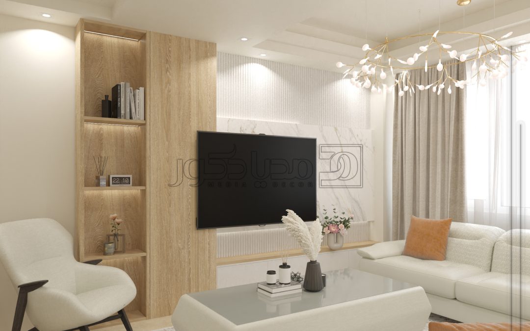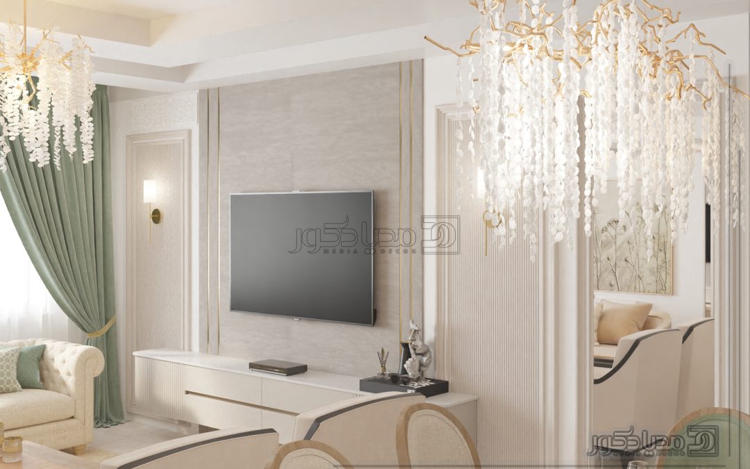 و خب از آن جا که خواسته و نیاز کارفرما برای گروه مدیا دکور اولویت است، طراحی را به سبک نوکلاسیک انجام دادیم. به علاوه باید بگویم که علاوه بر طراحی پذیرایی، پروژه پارسین شامل طراحی آشپزخانه به سبک تلفیقی و کلوزت روم به سبک مدرن هم می باشد که در ادامه تصاویر آن ها را مشاهده خواهید کرد.
