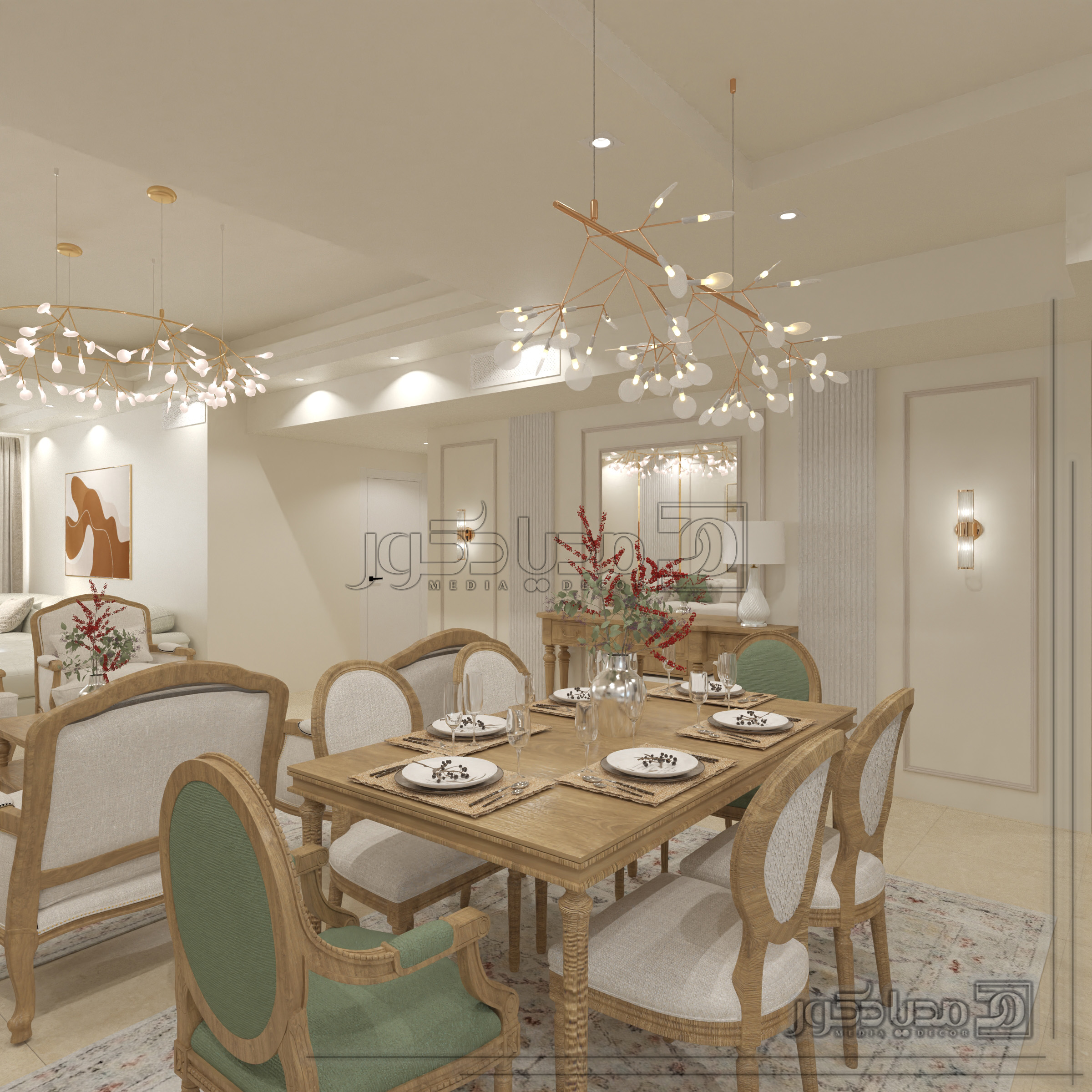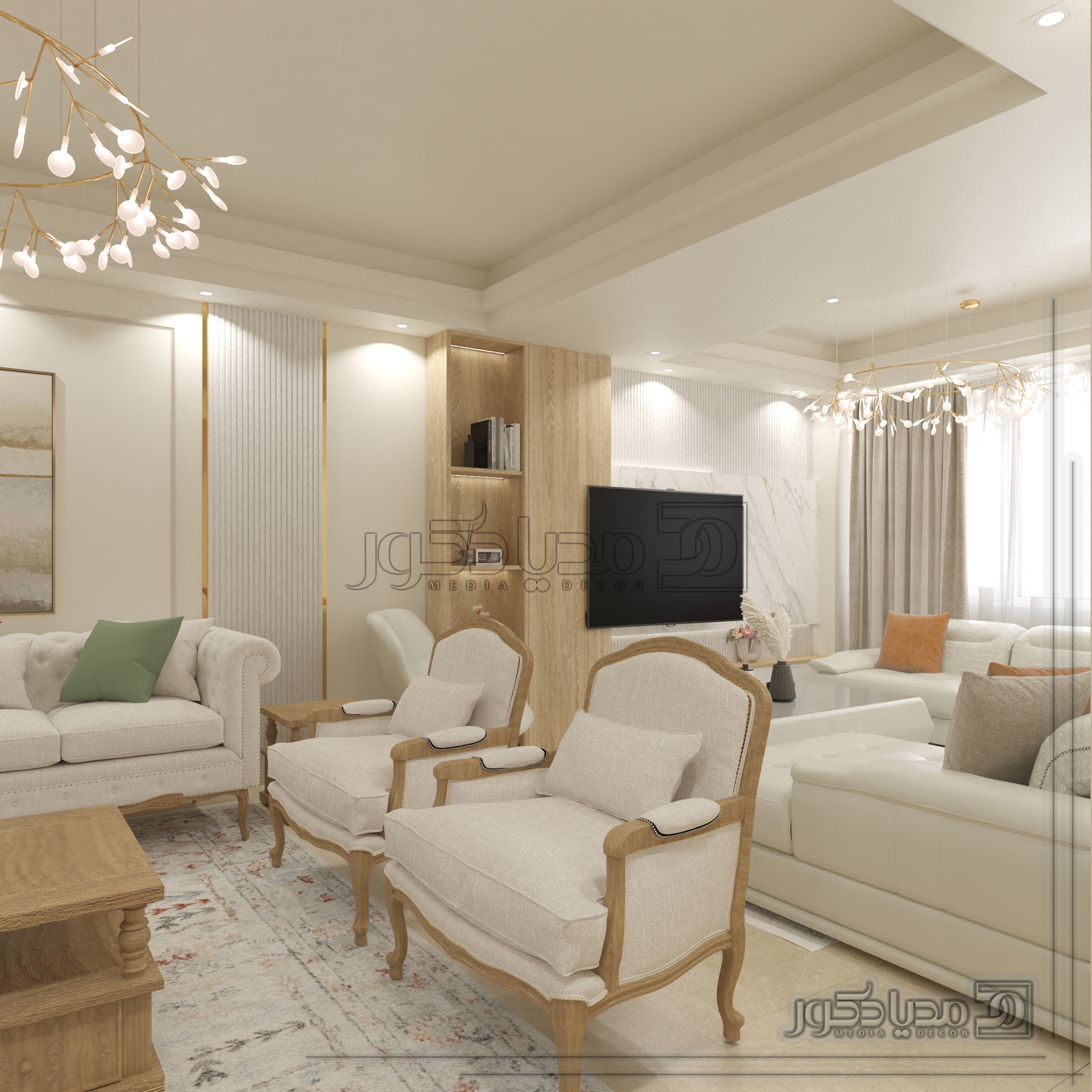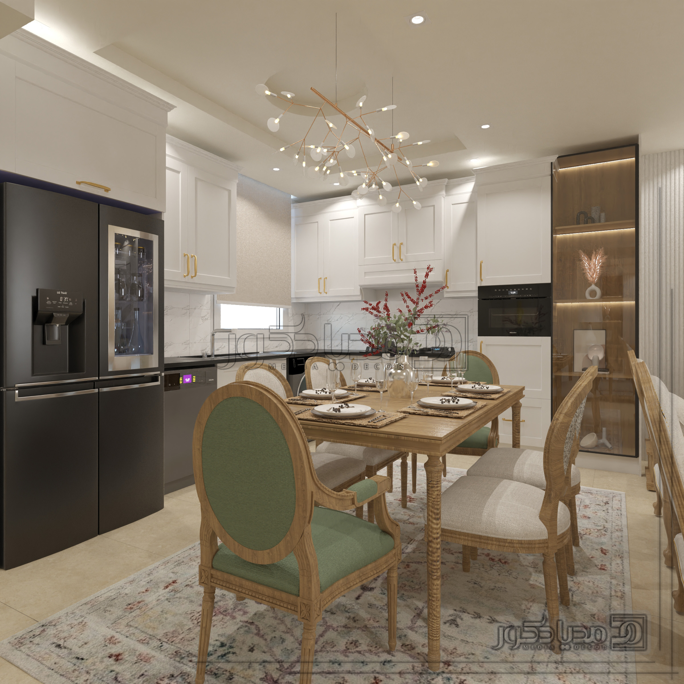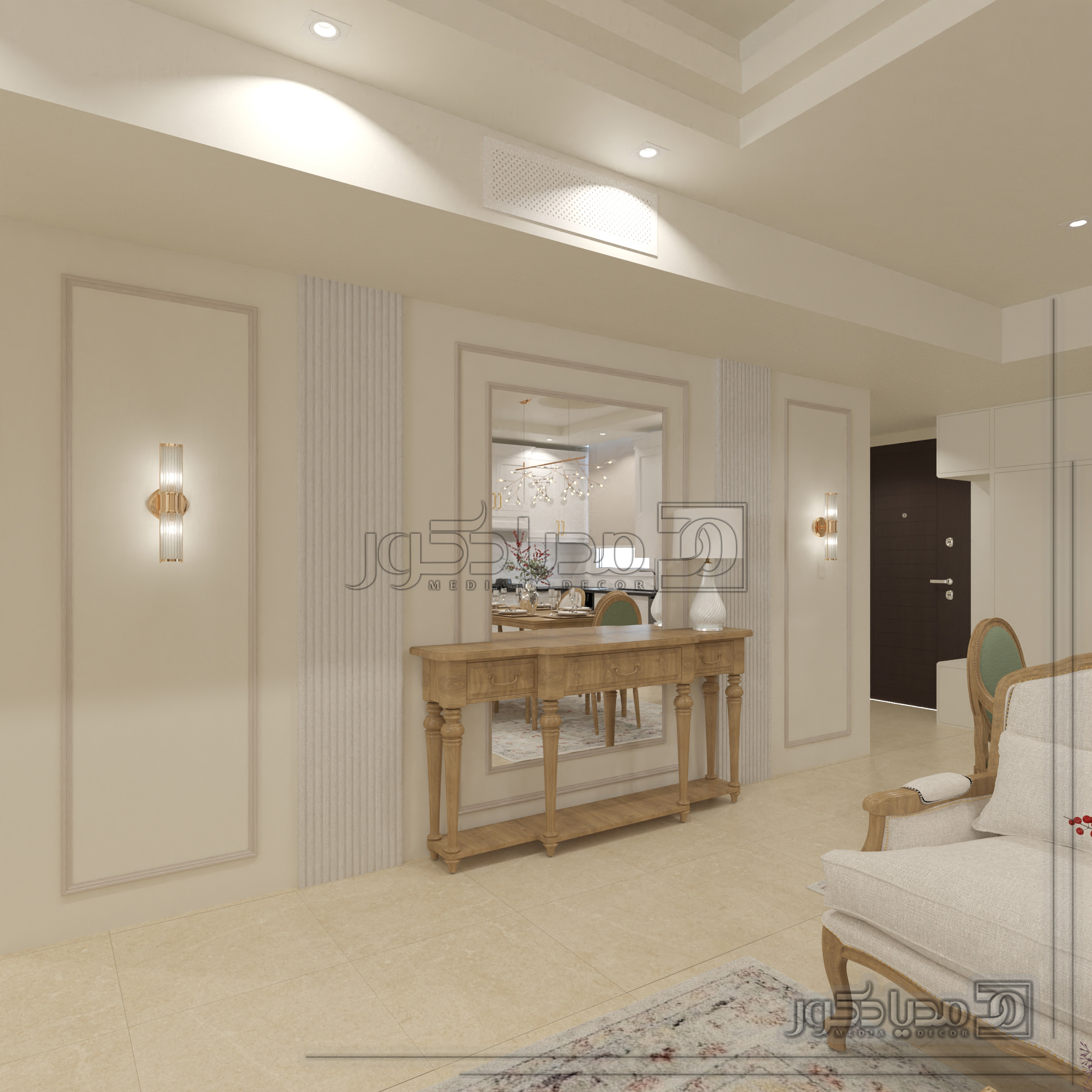 اما باقی فضا را به سبک نئوکلاسیک می خواستند. یعنی مبلمان پذیرایی و میز ناهار خوری و دیزاینی دیوارهای آن به سبک نئوکلاسیک انجام بشود.