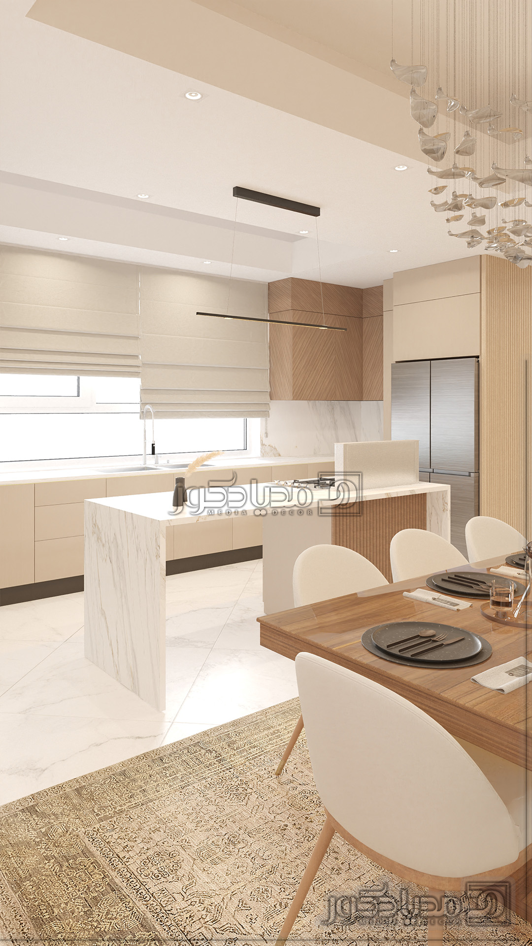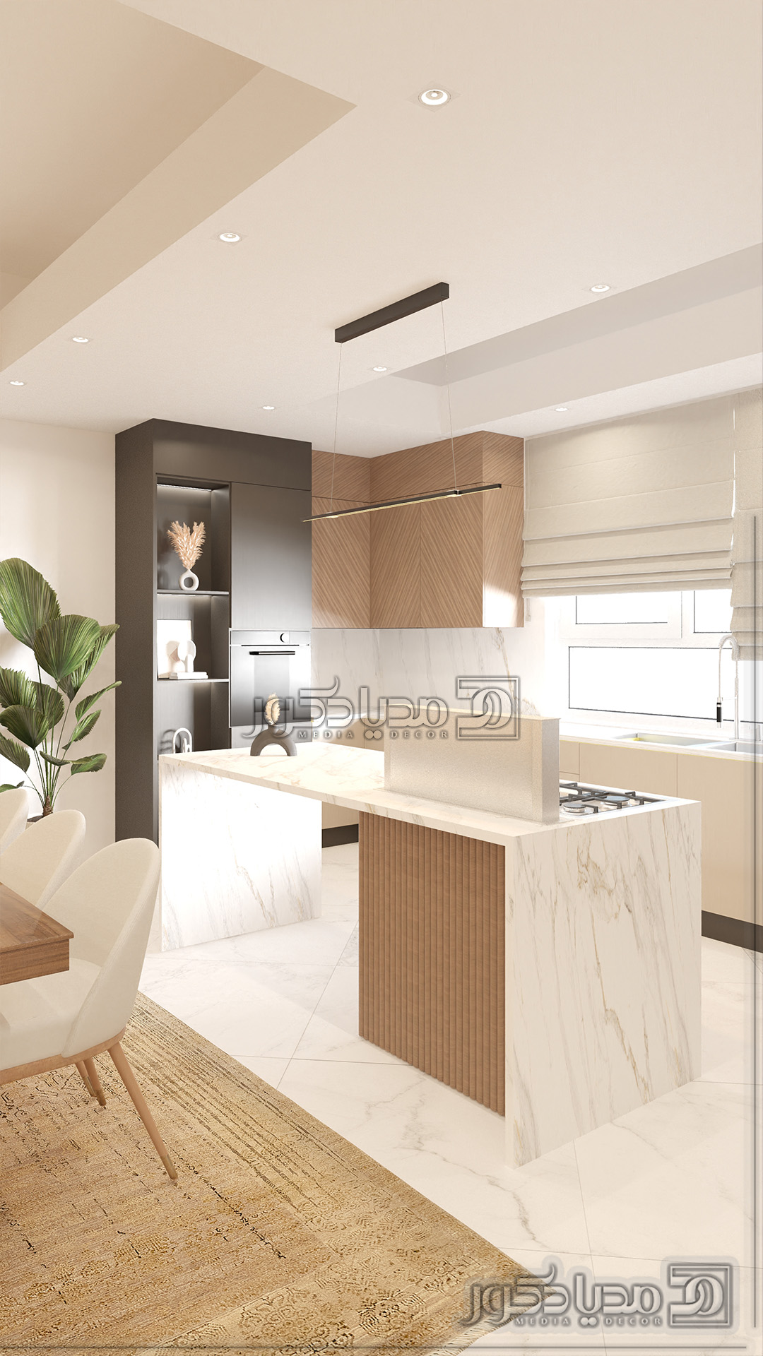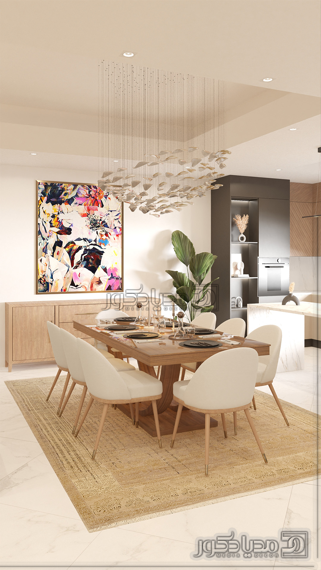 باید بگویم که این پروژه جزو خدمات طراحی داخلی و فرنیش مدیا دکور است، در این پروزه علاوه بر طراحی دیوار و اشپزخانه، به طراحی فضا با مبلمان هم پرداختیم. و در انتها تمام این مبلمان که موجود در بازار هستند را با ابعاد و فروشگاه ها برای خرید، معرفی کردیم.