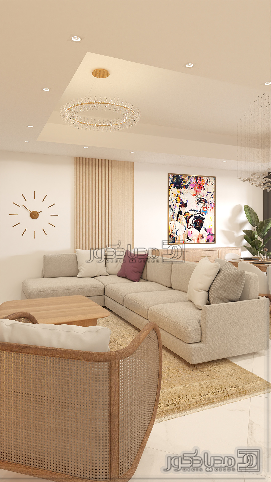 به همین دلیل ما سبک معاصر را برای دیزاین این خونه انتخاب کردیم. همچنین از رنگ های نود به عنوان رنگ اصلی و از رنگ یاسی به عنوان رنگ مکل برای دیزاین این منزل استفاده کردیم.
