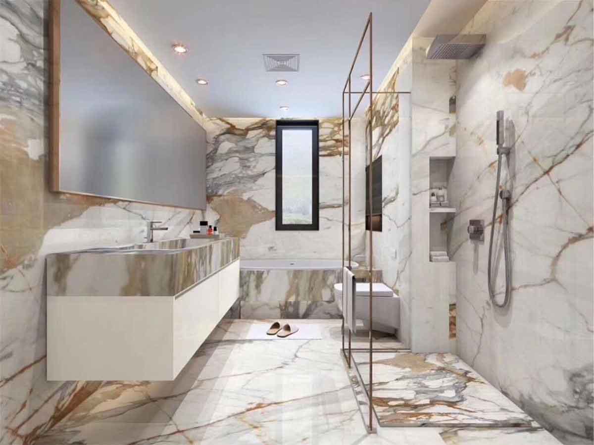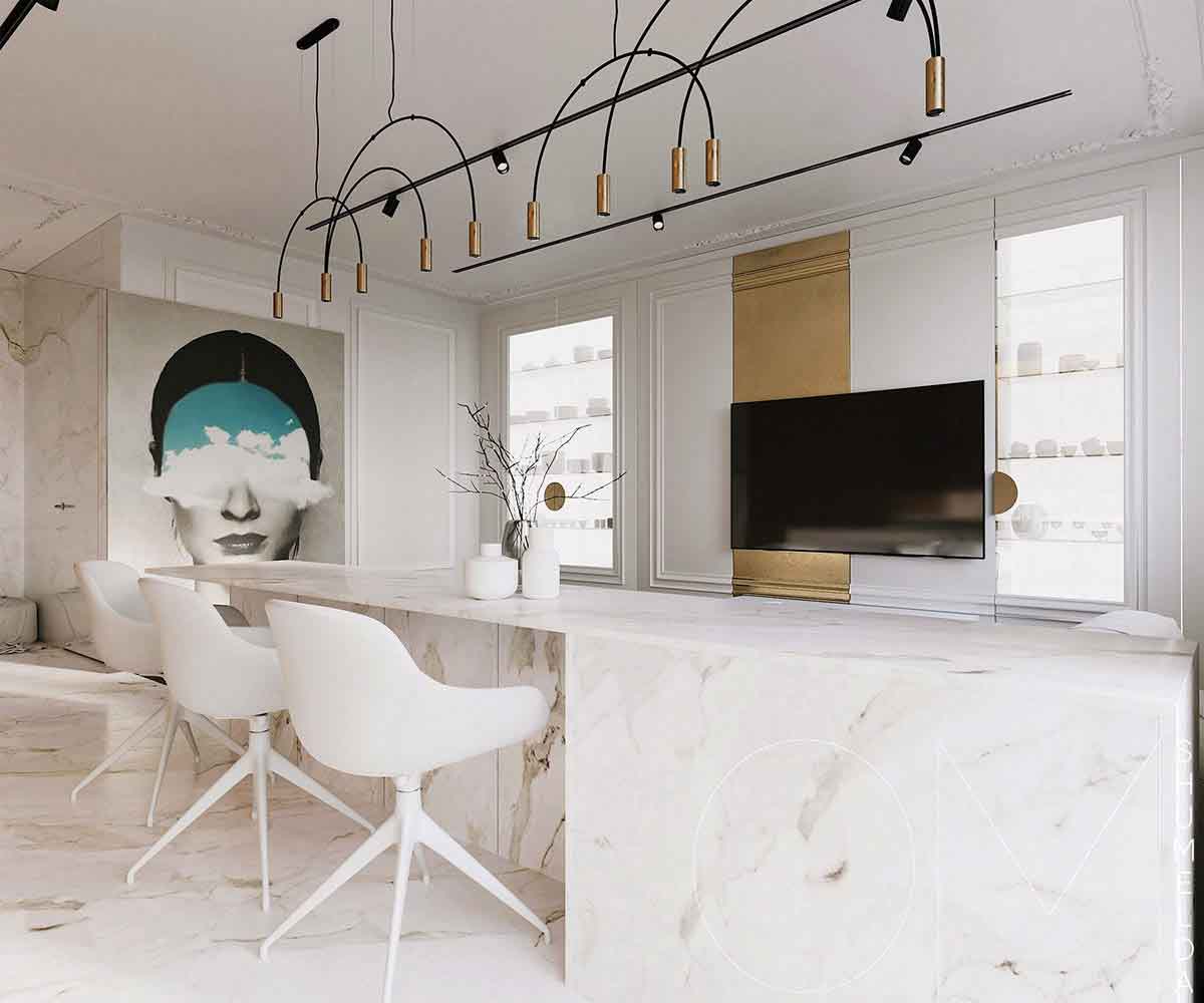 نکته: به غیر از دیوارپوش و کفپوش مرمری، دیگر سطوح را هم سفید طلایی انتخاب کنید تا هارمونی و انسجامی زیبا در فضا ایجاد شود.