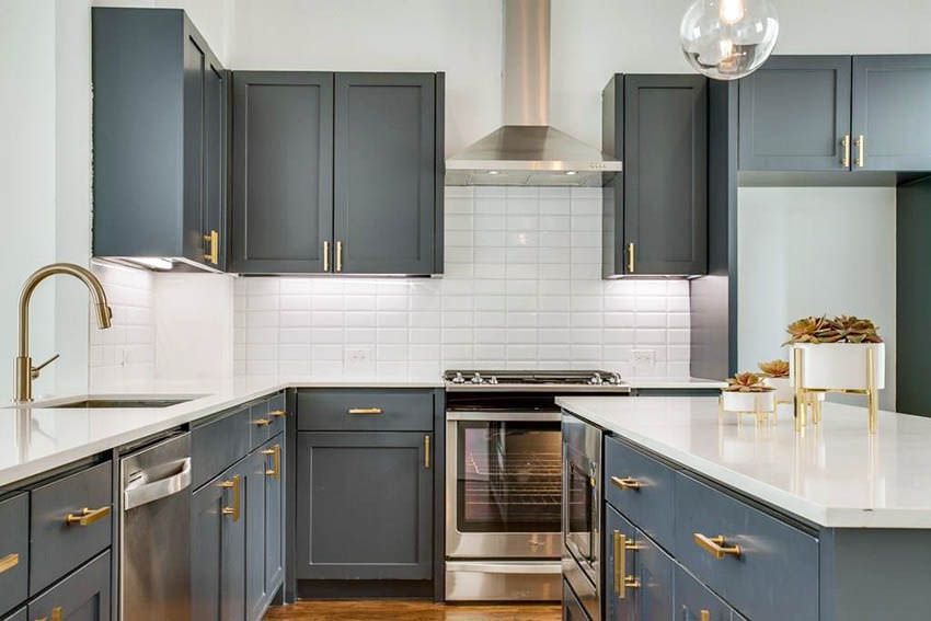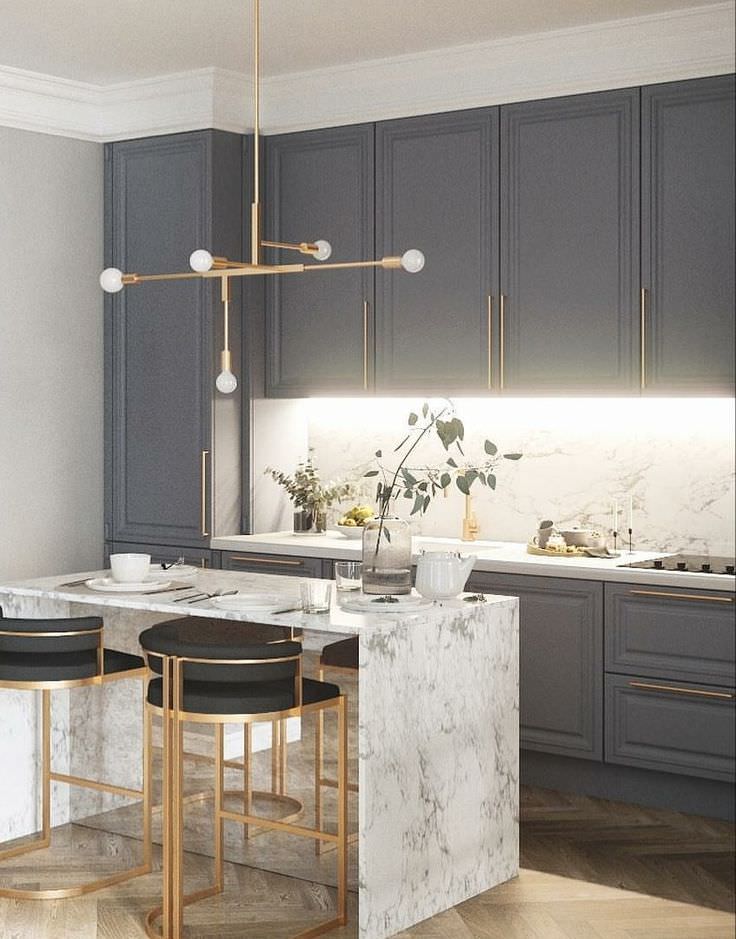 هر دو این آشپزخانه ها، کابینت های طوسی رنگ با دستگیره های طلایی دارند. اما تفاوت آن ها در نوع طیف طوسی است که در کابینت ها به کار رفته است.
