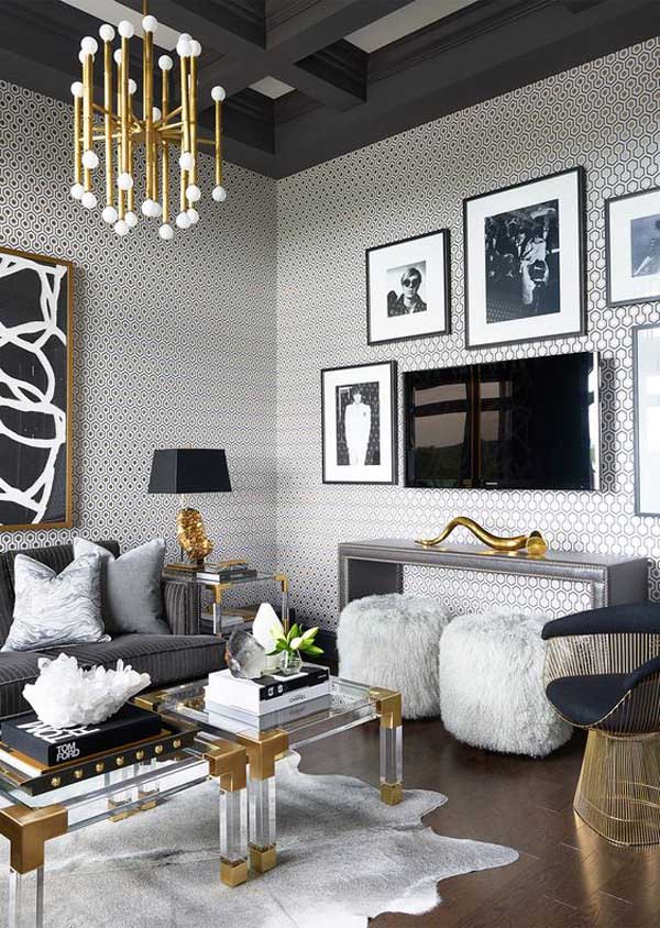 برای این کار می توانید رنگ غالب خانتان را سفید و رنگ اکسسوری و دکوری ها را طلایی انتخاب کنید. همچنین می توانید طلایی را با قاب بندی ها و یا طرح و پترن های کاغذ دیواری، روی دیوار سفید به کار ببرید.