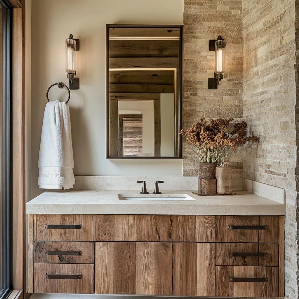 ۵. کابینت روشویی با متریالهای طبیعی و آینههای با قاب بافتدار