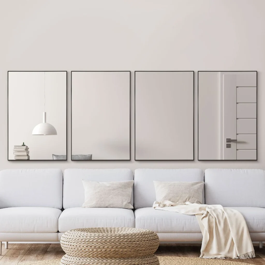 2. استفاده از پنلهای آینهای مربعی روی دیوار پشت مبل