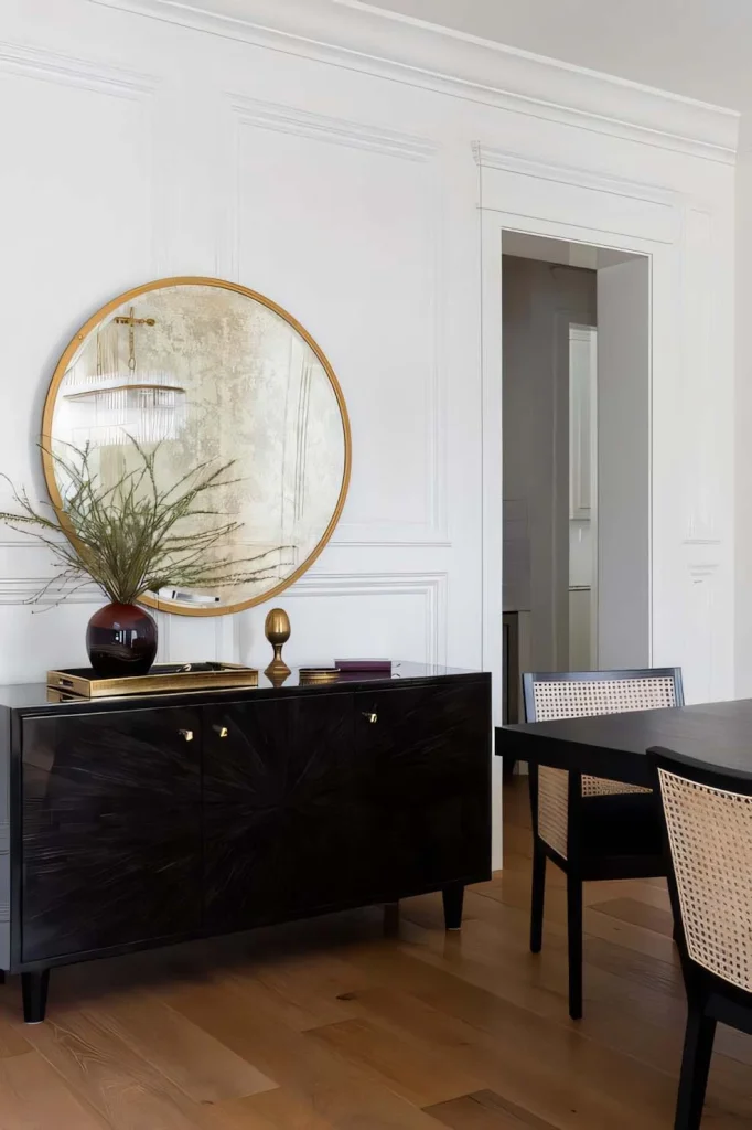 در فضای ناهارخوری، نصب یک آینه گرد طلایی باعث تقویت نور و حس توازن می‌شه. این آینه هم برای خانه‌های مدرن و هم نئوکلاسیک مناسبه و به خصوص در کنار لوسترهای شیشه‌ای جلوه‌ای چشمگیر پیدا می‌کنه.