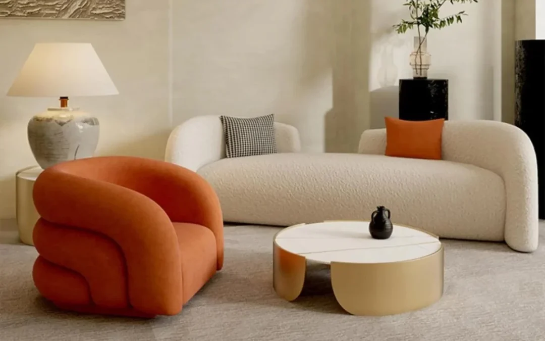 • ویژگی برجسته: پارچه‌های کتان یا پشم، رنگ‌های سفید و پاستلی، پایه‌های چوبی با خطوط منحنی