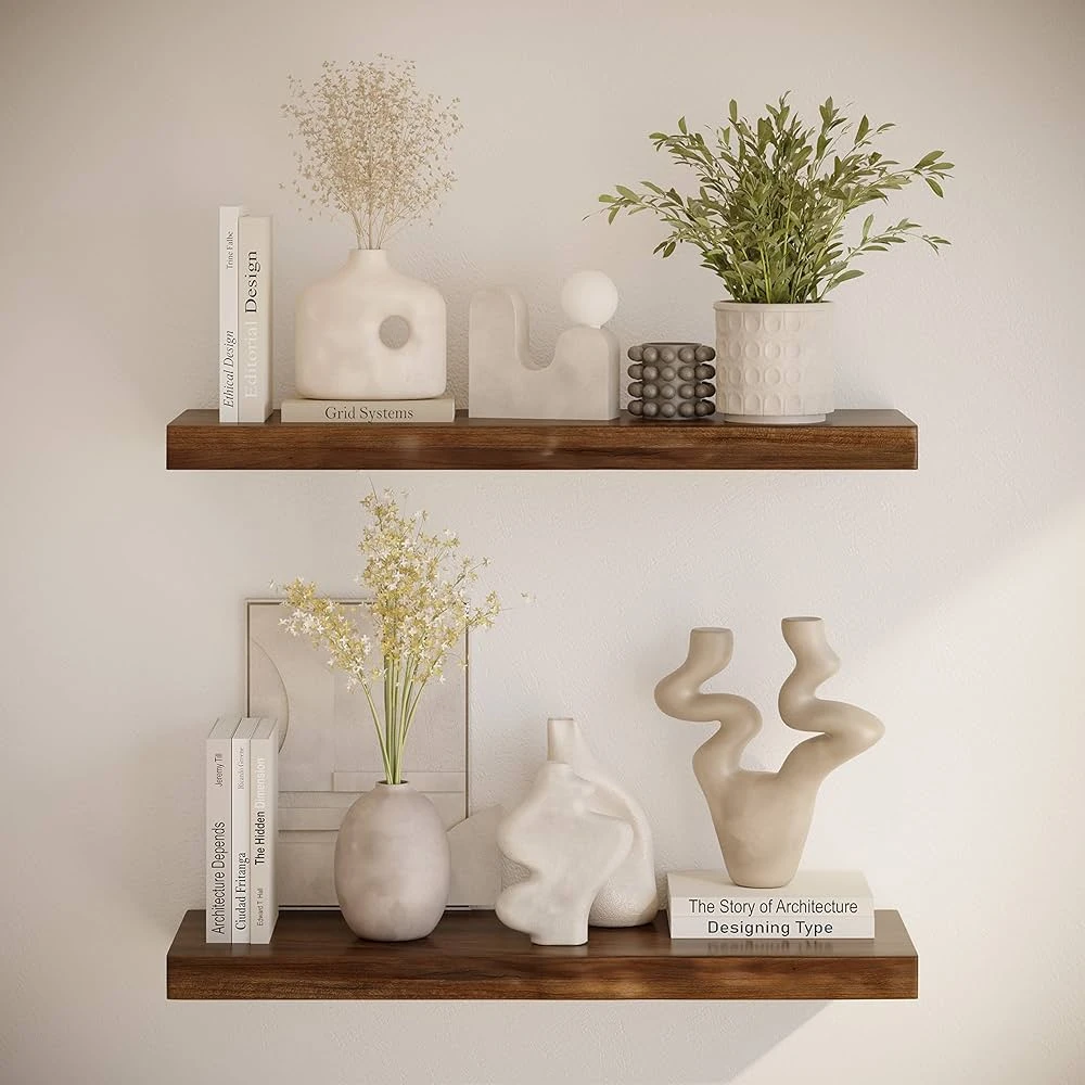 اگر دنبال حس طبیعی، گرم و بیتکلف هستی، شلفهای چوبی با لبههای منحنی یا بافت گرهدار انتخاب مناسبی هستن. مدلهای شناور، یعنی اون مدل هایی که پایه شان قابل دیدن نیست، باعث میشن فضای دیوار خلوت و مینیمال به نظر برسه. یادتون باشه که رنگهایی مثل گردویی، بلوطی یا چوب خام، گزینه های خوبی برای این نوع شلف ها هستند.