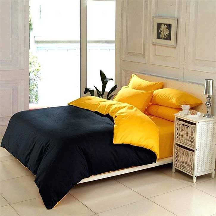 ست سرویس روتختی ساده و شیک هتلی یک نفره مشکی زرد، طراحی تک رنگ دو رو، جنس پلی کتان، شامل لحاف، کاور کوسن روتشکی و روبالشی