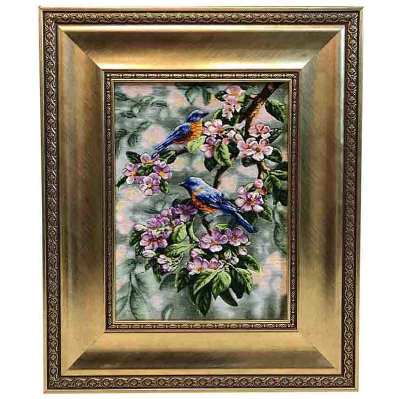قیمت و خرید تابلو فرش دستباف گل ابریشم تبریز طرح گل و بلبل با تراکم 45 رج، دارای قاب در رنگ طلایی، مخصوص نصب روی دیوار