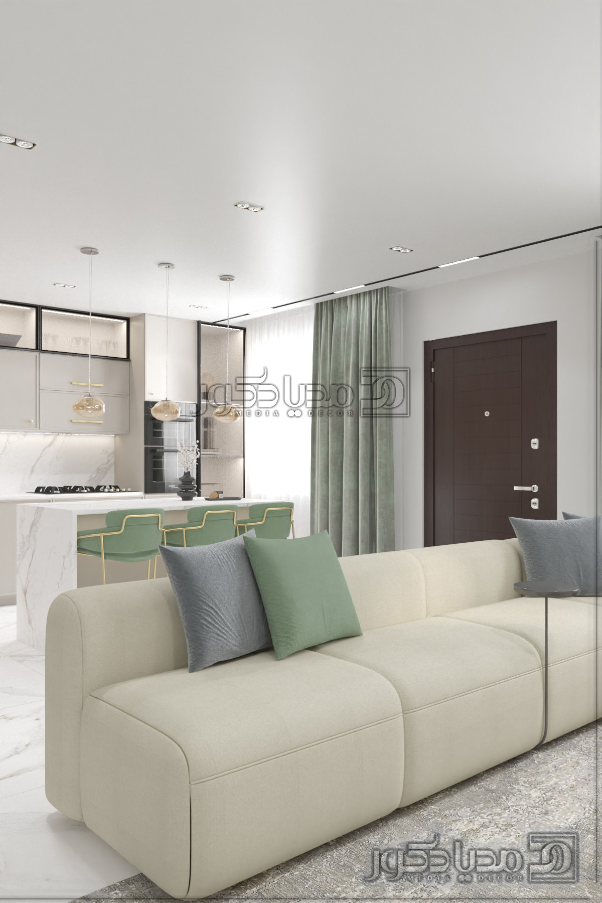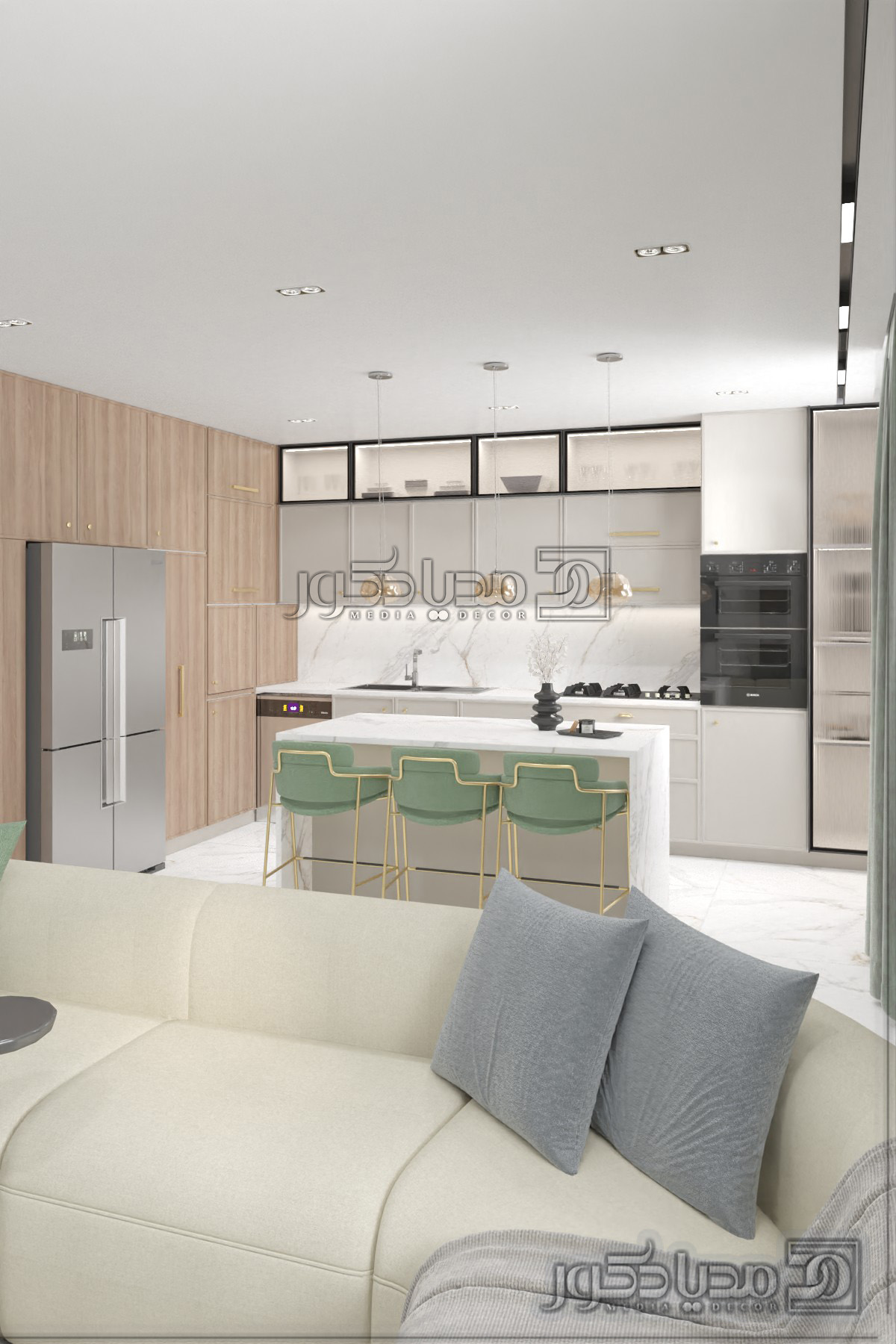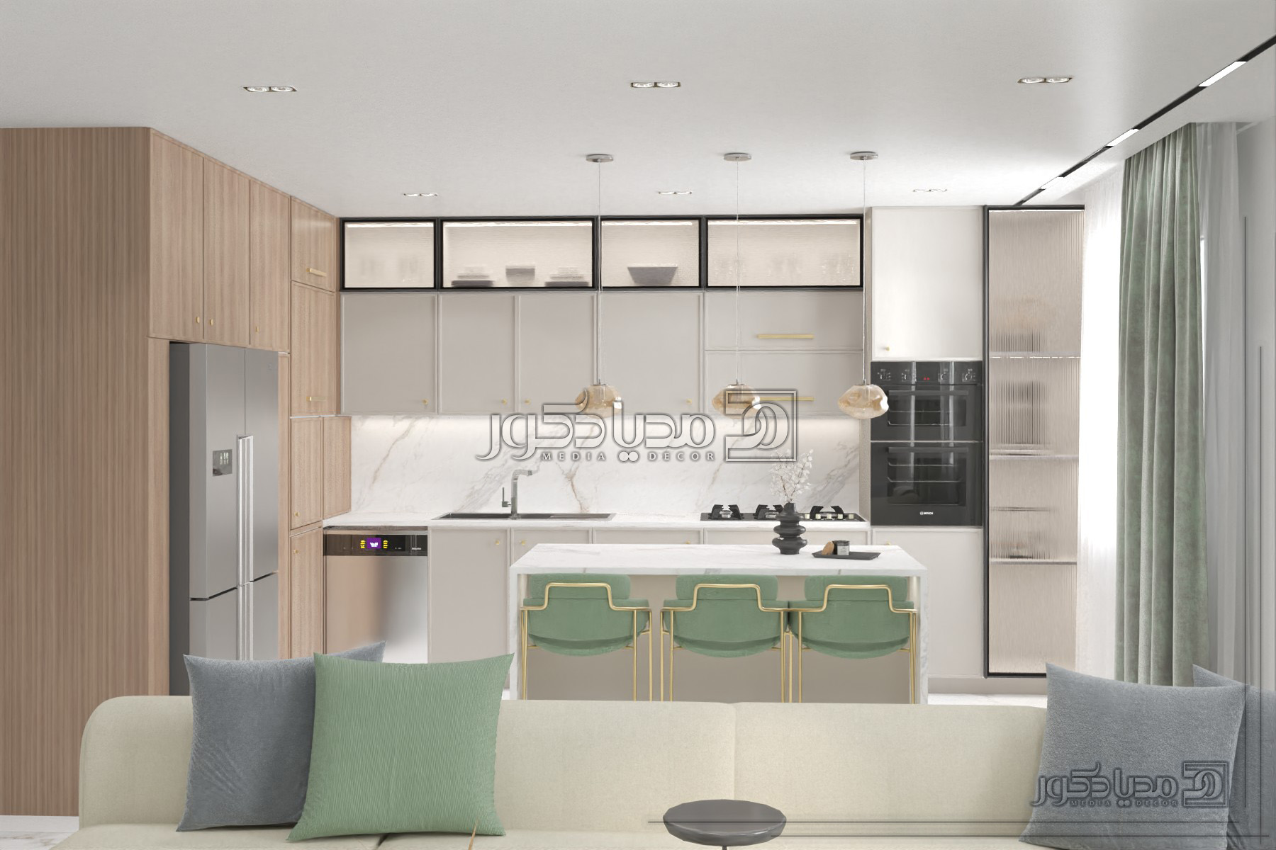 باید بگویم که این پروژه جزو خدمات فرنیش و طراحی داخلی مدیادکور است که علاوه بر انتخاب مبلمان طراحی آشپزخانه، سقف و دیوار ها هم شامل می شود.